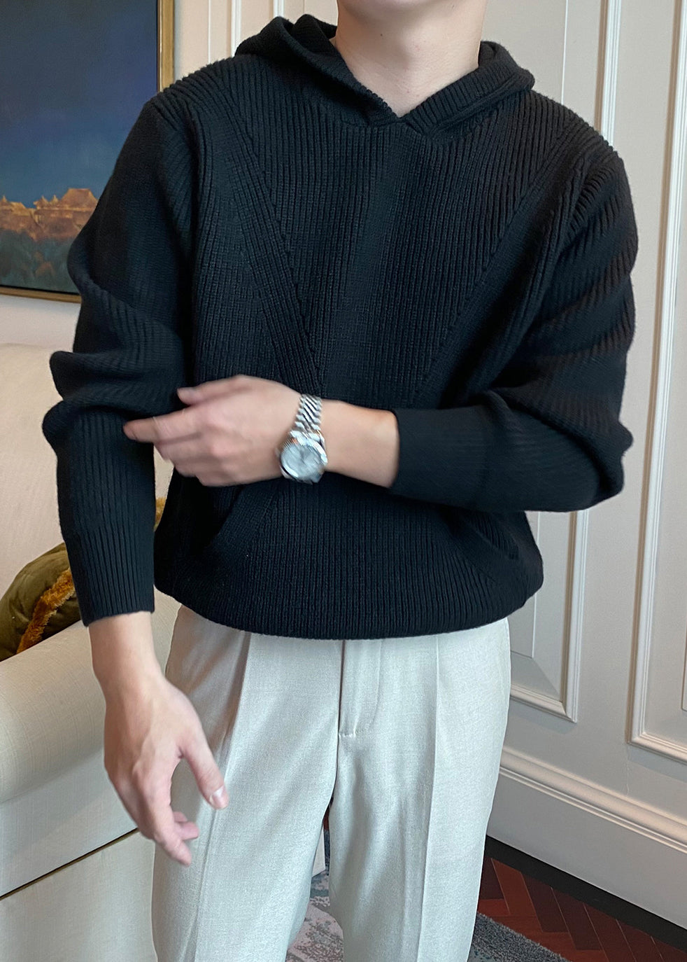 The sculpted knit and V-shaped chest weave widen the chest visually for a confident, professional look. Pair with trousers and leather shoes to instantly upgrade a casual hoodie into business casual—perfect for client meetings, office days, or after-work drinks where you want to appear sharp without effort.
